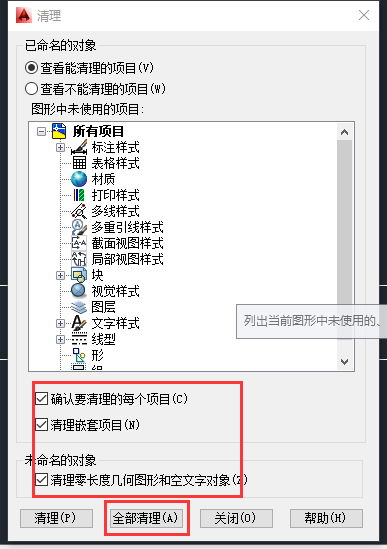 弹出对话框,选择清理全部。 清理完成之后,再la一下,看看还有多少图层?不会超过五个图层了吧,如果超过了,那就重新再来 一遍。同时再看看原来的图纸有多少M?现在的图纸有多少M?