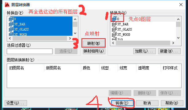 发现有什么不一样了吗?这个图层转换器的右边由空白的变成了有很多图层,对了就继续点一下这个右边转换为的这个框内的0图层。然后按下图步骤操作