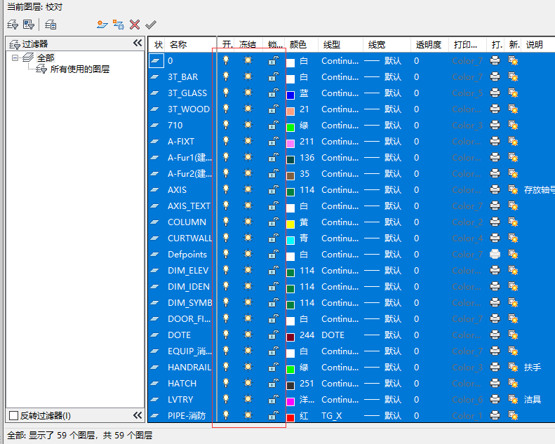 清理图纸准备: 1、在CAD上输入la快捷键进入图层管理如下图: