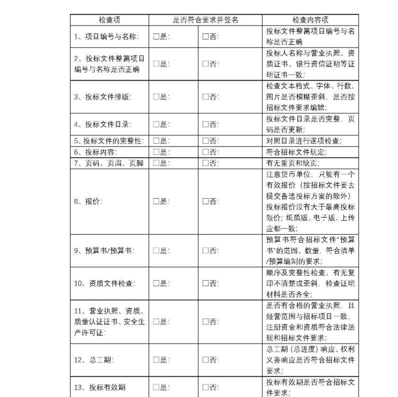 一篇比较简单的投标文件核对表格