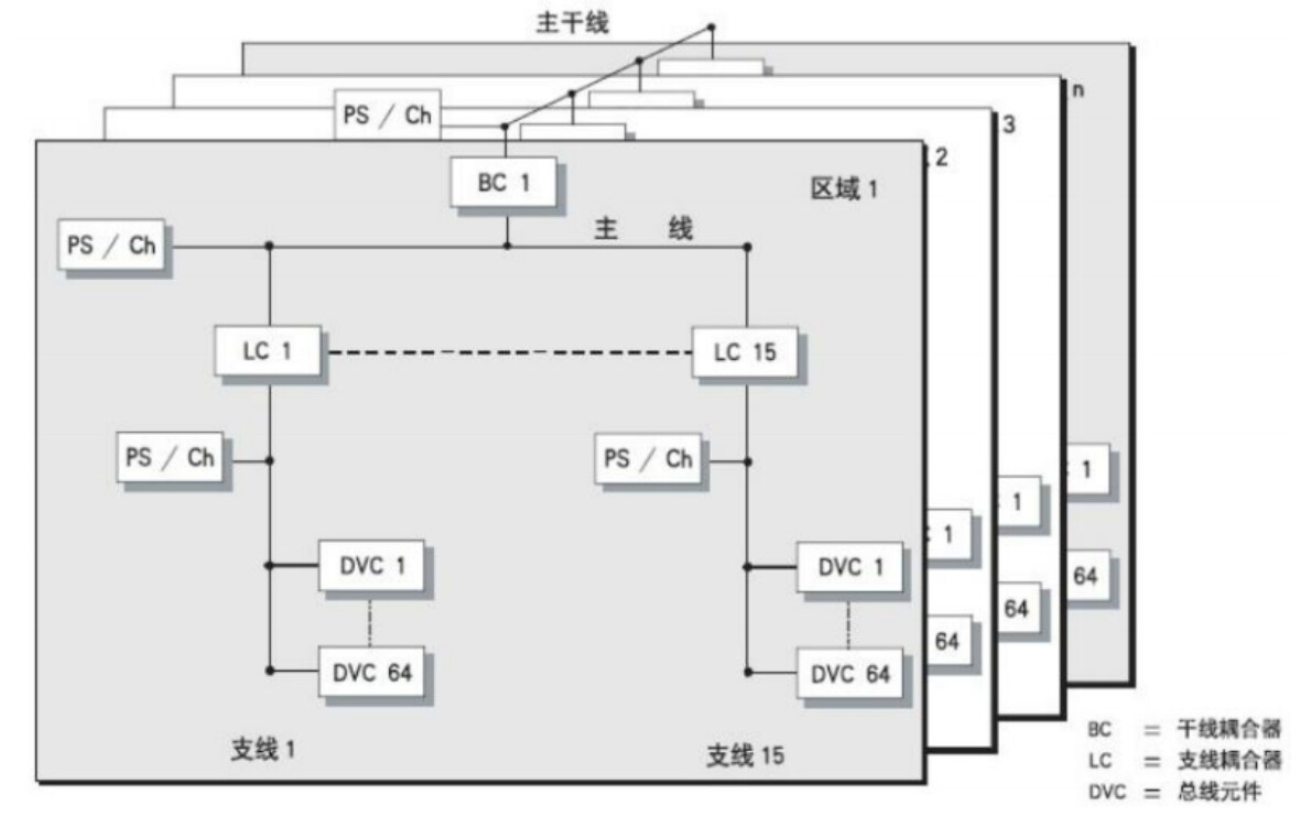 干线可通过干线耦合器(路由器)组成对个区域,一般情况下,一个KNX系统可接14400(15*15*64)个总线设备。一般KNX系统线路和干线都采用KNX通讯,如下图所示: